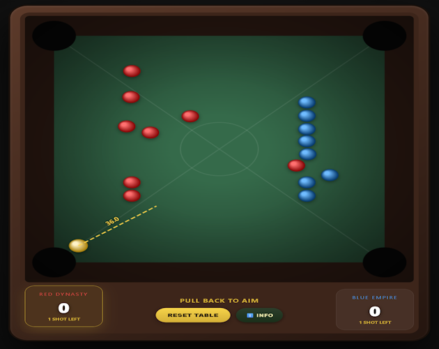 Striker Elite is a two‑player game played on a square board. Each player controls eight discs (red or blue) and a striker (golden disc). The goal is to pocket the opponent’s discs by striking them with your striker. The first player to pocket 8 opponent discs wins. The game starts with a random player chosen to go first, and the board is set up symmetrically.